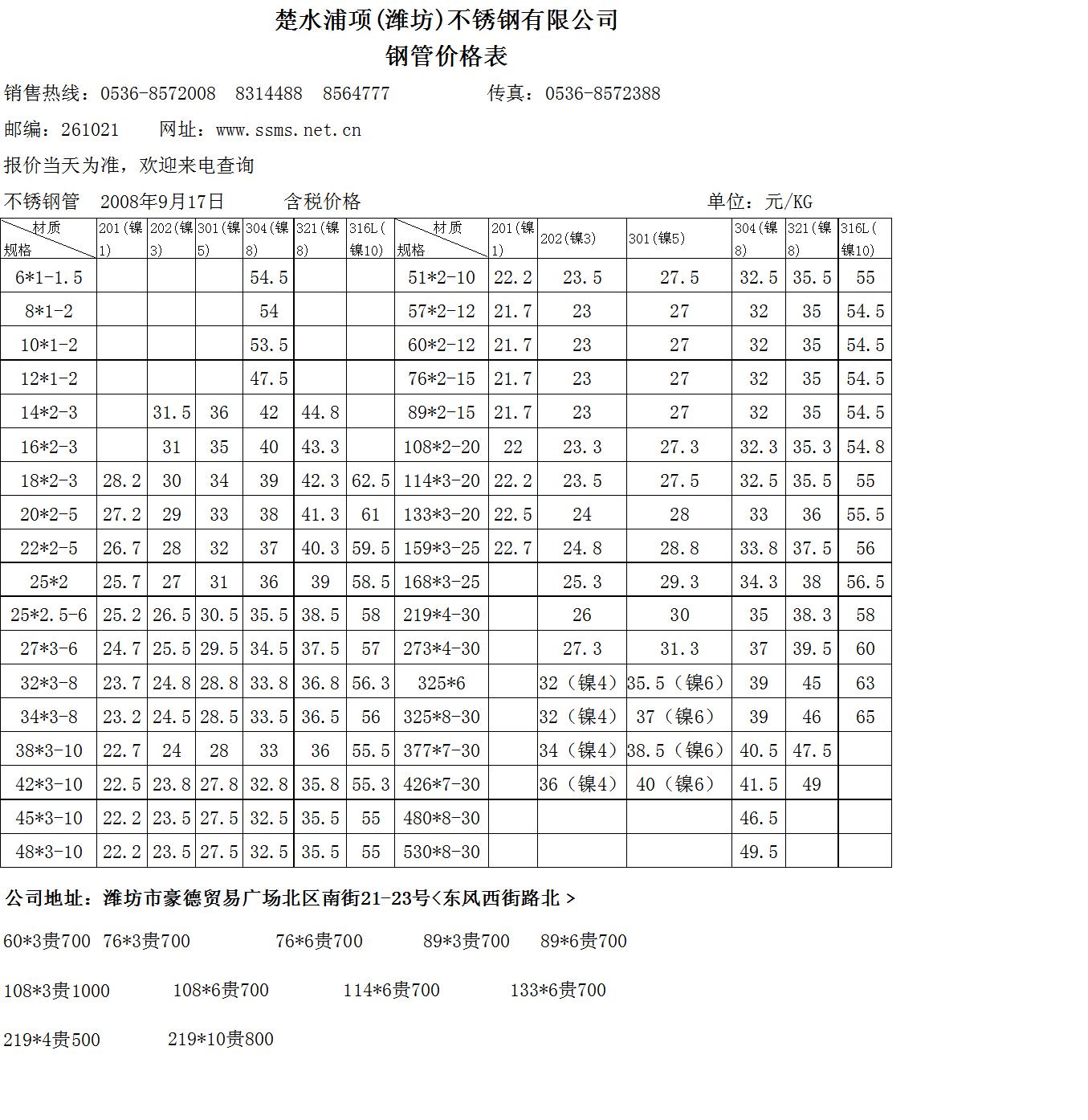 不锈钢钢管价格表